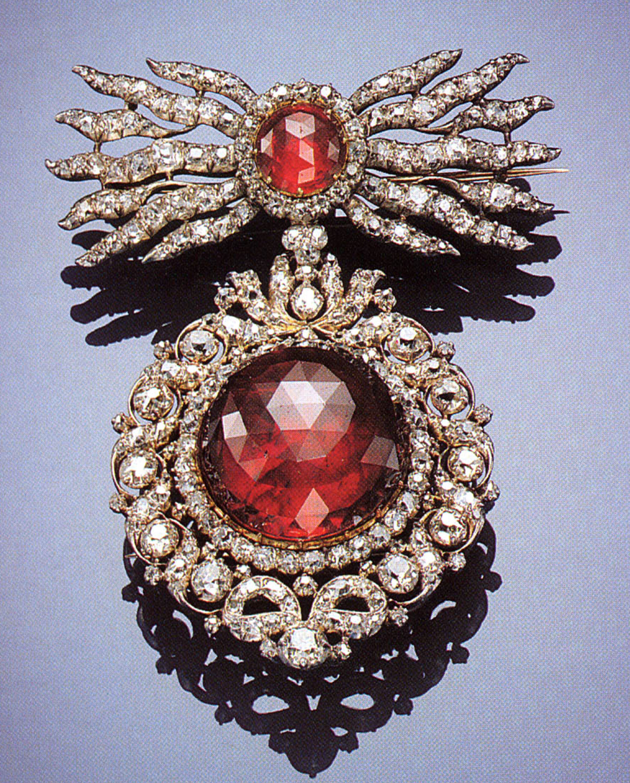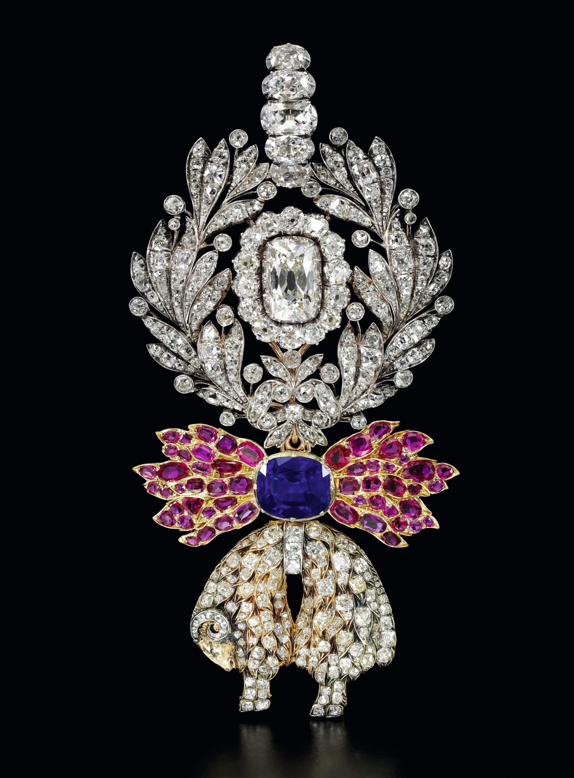 Louis-Antoine's neck badge, the surmount in the shape of a laurel wreath is entirely set with diamonds with a large cushion-shaped stone at the centre, the central flintstone component of cushion-shaped rubies and a sapphire supports a diamond-set fleece