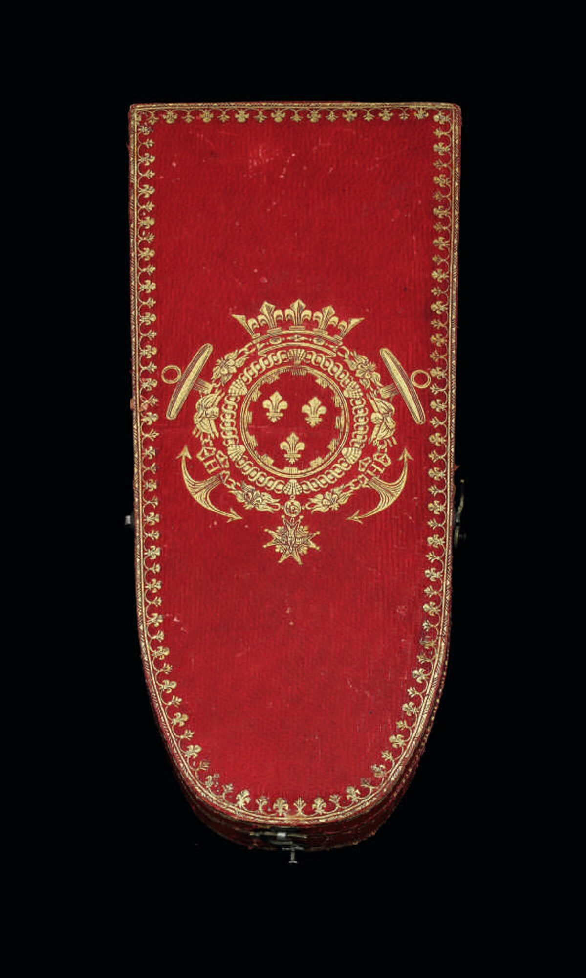 The original fitted case for Louis-Antoine's order, stamped with the coat of arms for the Duc d’Angoulême; on the reverse, a label is affixed which reads Toison d'or du Roi Charles X, in the handwriting of Princess Elias of Bourbon-Parma (1882-1940) - the Princess has incorrectly attributed the Golden Fleece to the father of its true owner