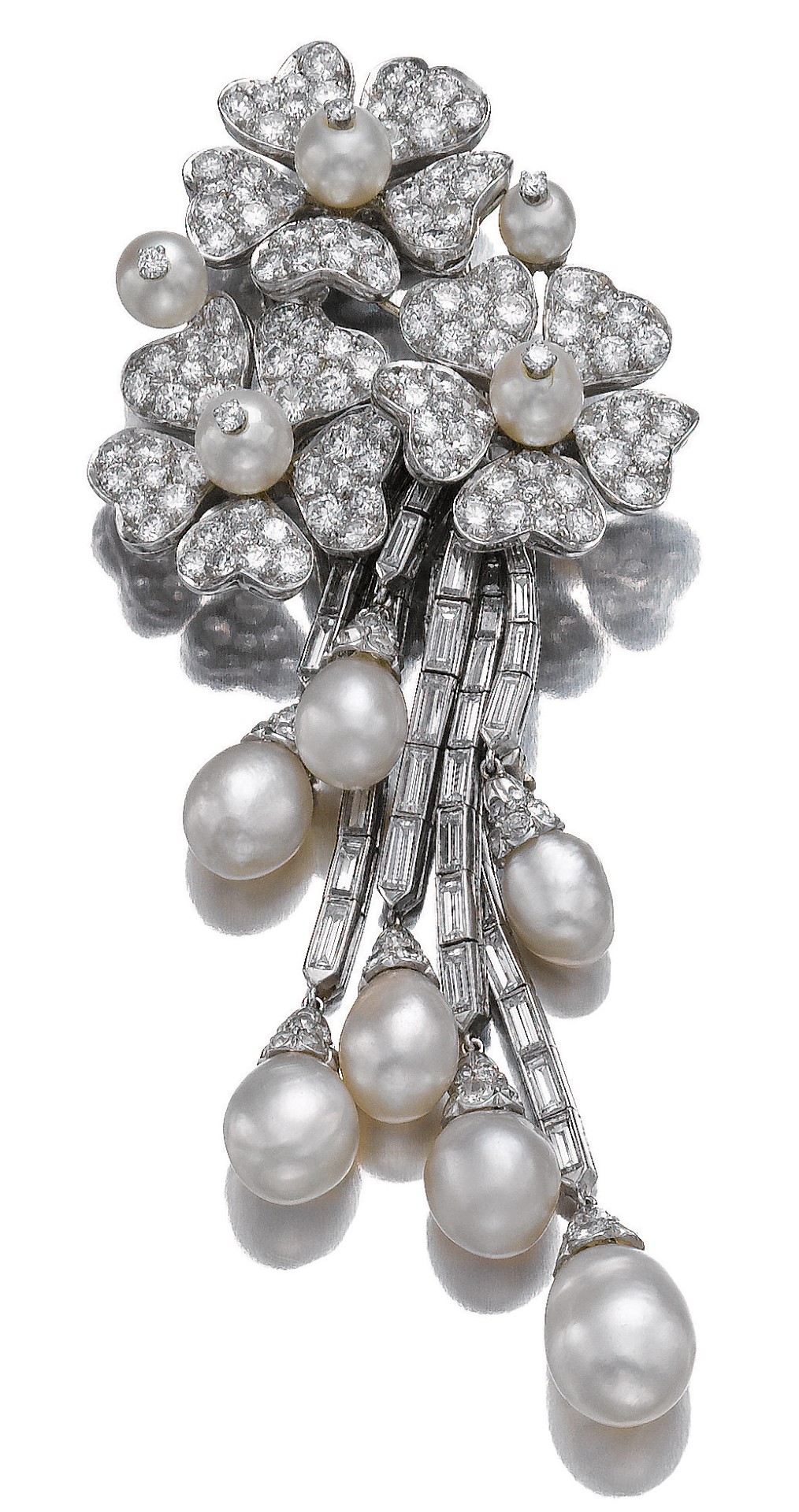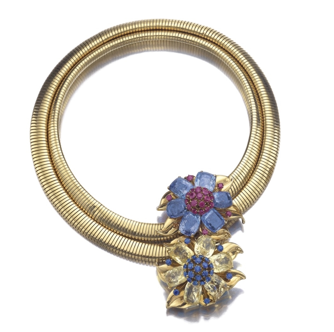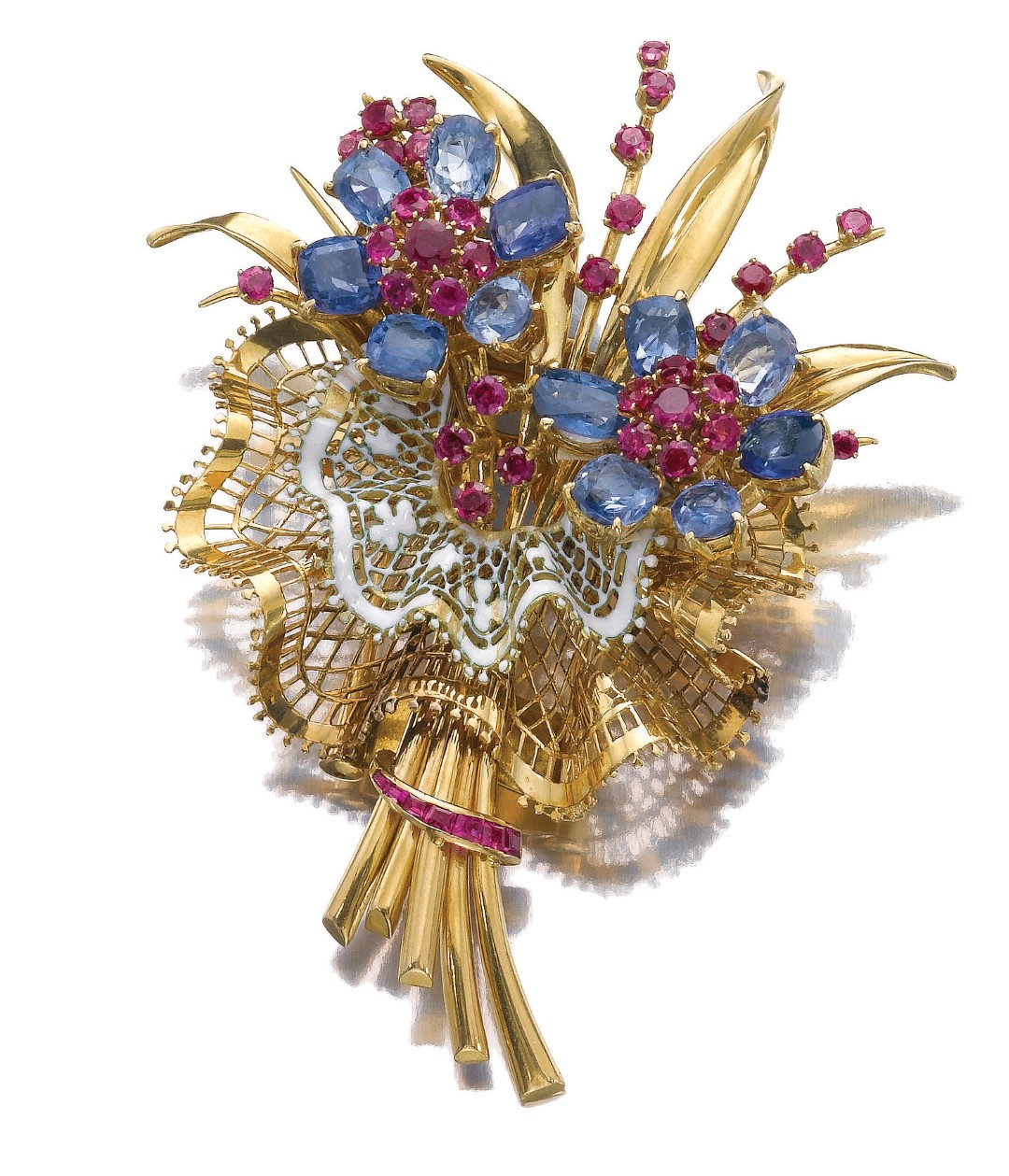 This symbolic jewel was created after Toussaint had produced a similar piece in 1942, at the height of the occupation, where a caged bird represented the imprisoned and suppressed French nation, steadfastly resisting their German aggressors. The red, white and blue of the released bird fittingly represented the national colours of France, Great Britain and the United States. By popular demand, a new era in jewellery design was ushered in, characterised by a bright palette and a sense of playfulness – in reaction to the long, grinding years of the War, austerity and rationing.