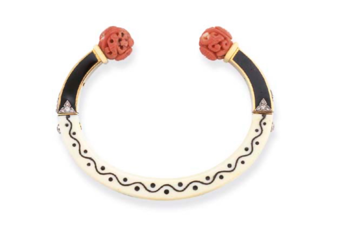 By contrast, Cartier had earlier in 1919 created a series of elaborate jewels titled Soudanais – bangles of torque design resembling both gold and silver African examples from Nubia as well as those from ancient Europe. They were fashioned in ivory with elaborate inlays and were influenced by Sudanese designs with their incised ring and dot decoration, diamonds and pearl embellished the jewels and coral was used at the terminals. These elaborate and luxurious pieces were of course far removed from the traditional African jewels from which they were derived, although the use of ivory created the sense of exoticism and the link to Africa. The bangle is possibly the form from the fashion of this era which has had the most enduring influence, be it in simple lacquer or decorated with diamonds.