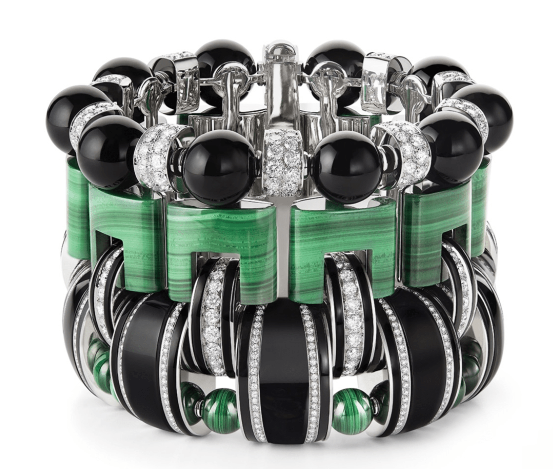 The African aesthetic continues to hold its sway in the output of contemporary jewellers. Boucheron replicated the important bracelet they created for the 1931 Exposition as part of their 2018 Nature Triomphante collection in the form of the ‘Graphique’ cuff’. In their reimagined bracelet, although the early and later designs are identical, the materials are very different. Only malachite is retained, with red glass and ivory replaced by onyx, black lacquer and diamonds, and it’s mounted in white rather than yellow gold. The bracelet displays its Art Deco roots; however, the use of diamonds places the piece firmly away from its original design source. Tiffany & Co have turned to Nancy Cunard with their black, ivory and red lacquer and Japanese hardwood bangles and the striking bone cuff created by Elsa Peretti.