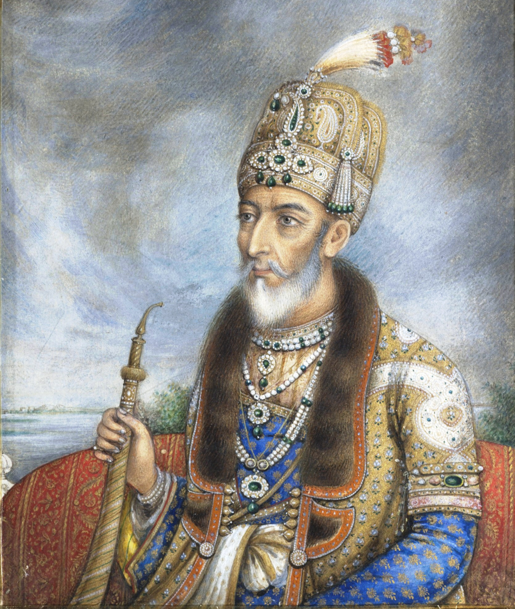Right: Shah Jahan on a terrace, holding a pendant set with his portrait, folio from the Shah Jahan album, painting by Chitarman (active circa 1627-70), ink, opaque watercolour, and gold on paper | Shah Jahan is exquisitely dressed and garlanded in jewels, with long strings of pearls across his chest and a tassel of pearls at his waist. His rank is stressed through his radiating halo and the hovering angels overhead. The work celebrates the skills of the craftsmen working at the Mughal court, notably jewellers, weavers, architects and stone cutters. This is Chitarman's earliest dated portrait and it was executed soon after Shah Jahan's accession.