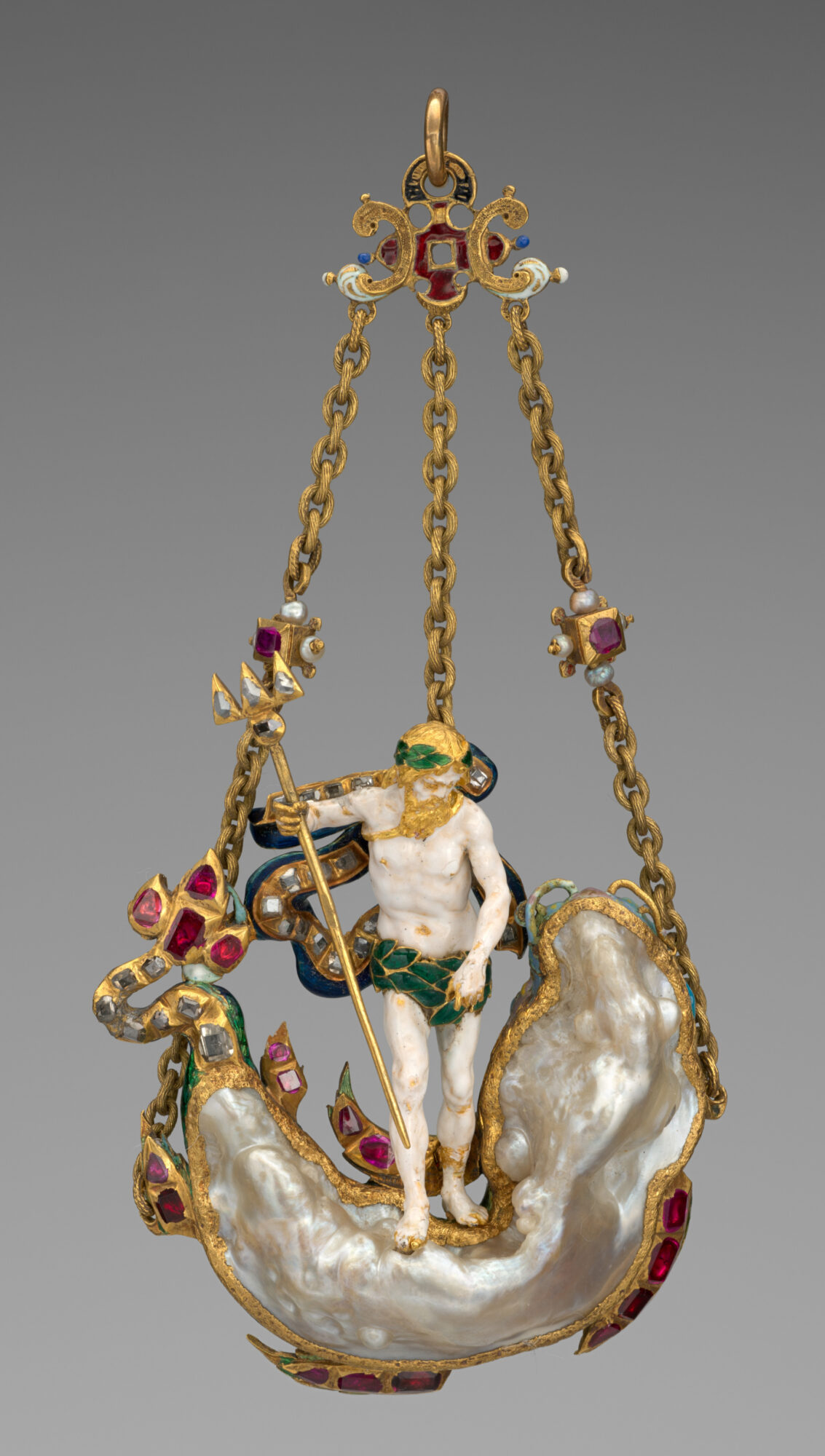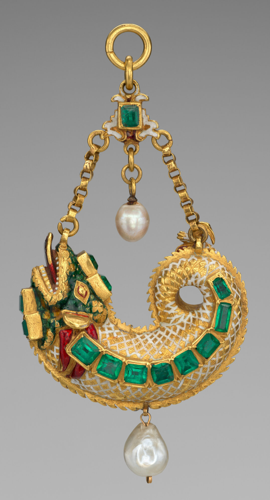 The founder of the Mughal Empire, Babur (1483-1530), and Humayan (1508-1556), his son, were not particularly engaged with jewels and gems. They conquered northern India in the early 16th century and they gave away the gold and gems they acquired from the region. Sadly, no jewels survive from these reigns. However, this indifference changed with Akbar (1540-1605) – he began to accumulate gems and left a substantial collection, his son Jahangir (1569-1627) continued collecting and his son, Shah Jahan (1592-1666) was so intrigued by the subject he undertook studies in order to become an expert. The Mughal Emperors naturally had the first pick of the gems extracted from their mines, and by law they automatically owned any stone weighing over 5 carats. Shah Jahan’s son, Aurangzeb (1618-1707) took control of the Golconda mines, at the time the only known diamond mine in the world, and along with diamonds, emeralds and spinels, natural pearls were in high demand, with the largest and most lustrous being highly coveted and the longest strands of pearls reserved for the Emperor and his sons. Until the close of the Mughal era, in 1857, the ruling Emperors are depicted with luxurious strings of pearls – sometimes interspersed with precious stones – worn around their necks, at their wrists and ankles and draped over headpieces and turbans. No other gemstone was worn in such quantities and in so many ways as the natural pearl.