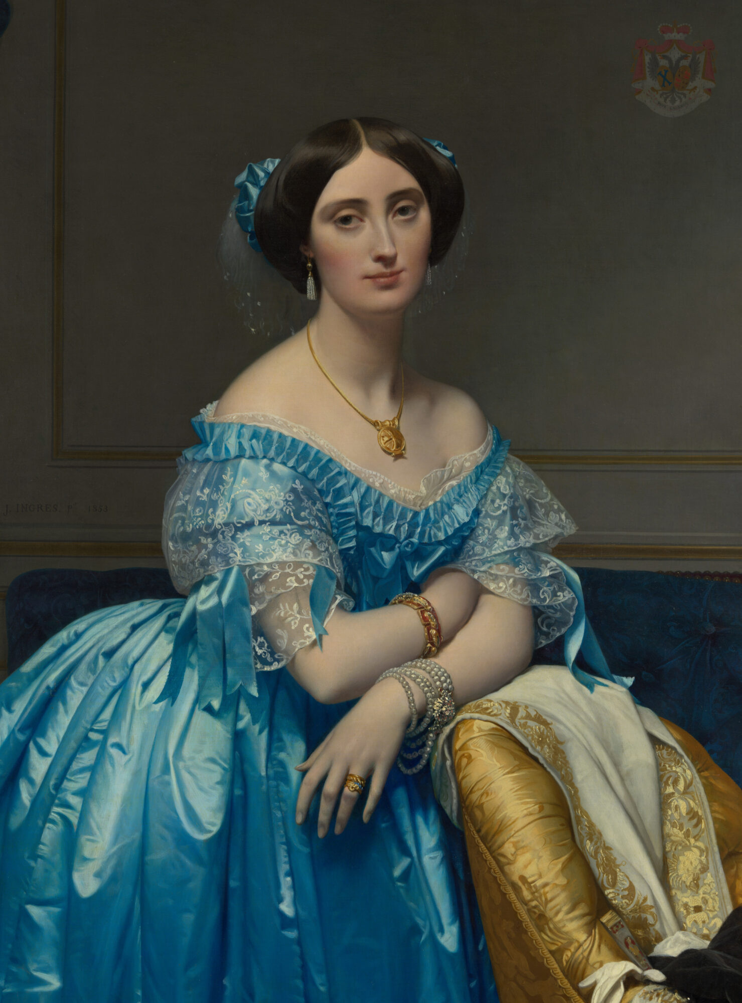 The woman is dressed in French-inspired clothing - luxurious yet restrained - she wears a single row of pearls at her neck and on her lavishly beaded headdress, edged in pearls, a brooch featuring pearls of a substantial size is pinned, another impressive pearl brooch is worn on her shoulder.