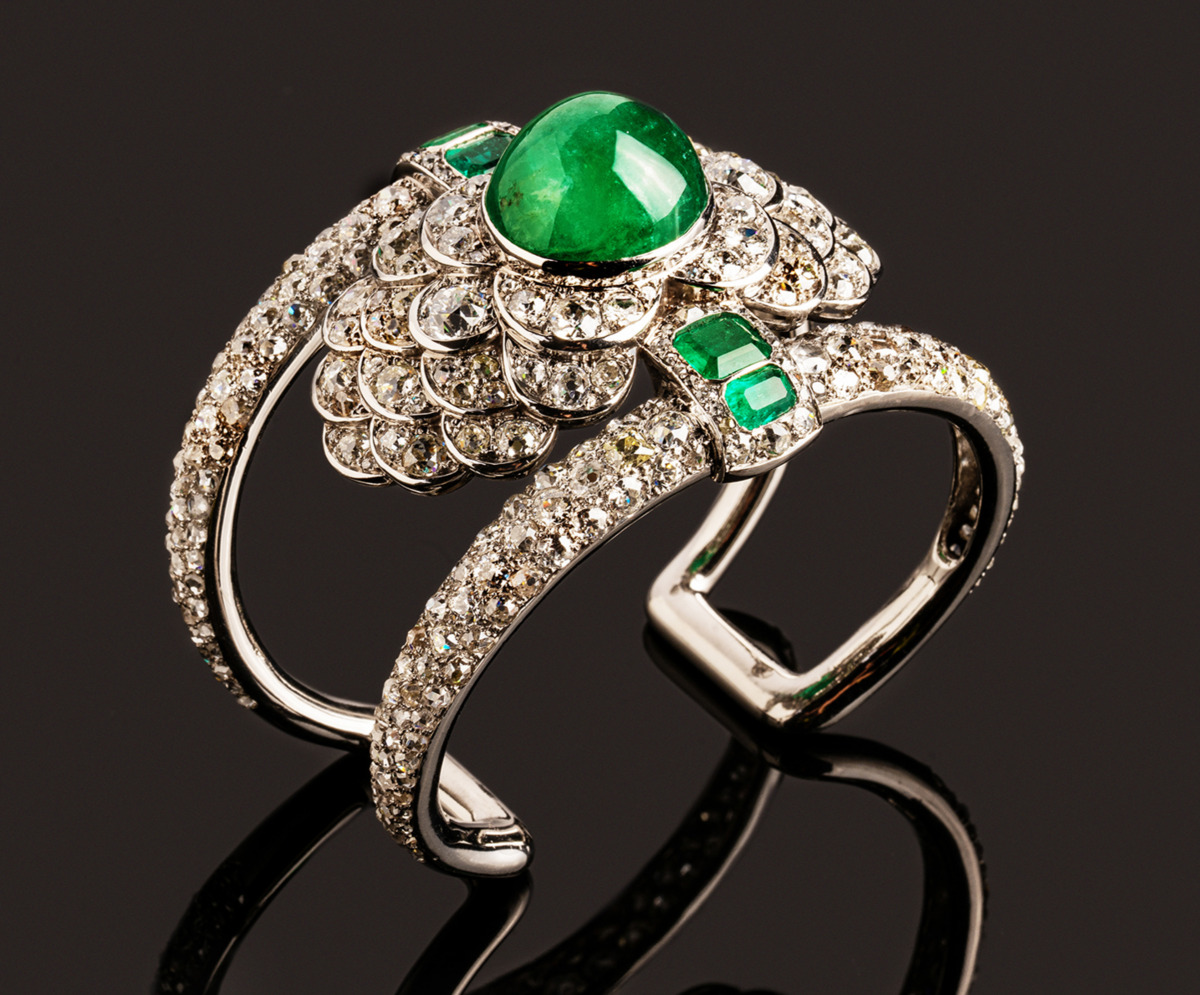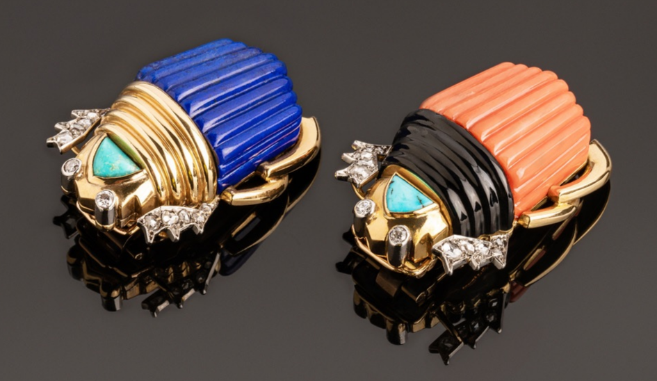 From an interesting selection of vintage jewellery, two pieces caught our attention: a diamond and emerald bracelet by Suzanne Belperron, 1935, and a pair of scarab or beetle brooches, Cartier, circa 1946.