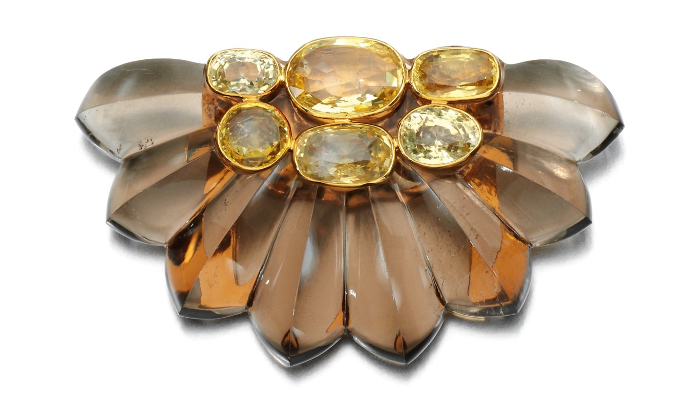 A smoky quartz, yellow sapphire and citrine brooch, Suzanne Belperron, Paris, circa 1935. Famously Belperron did not sign her jewels believing that her style was her signature.