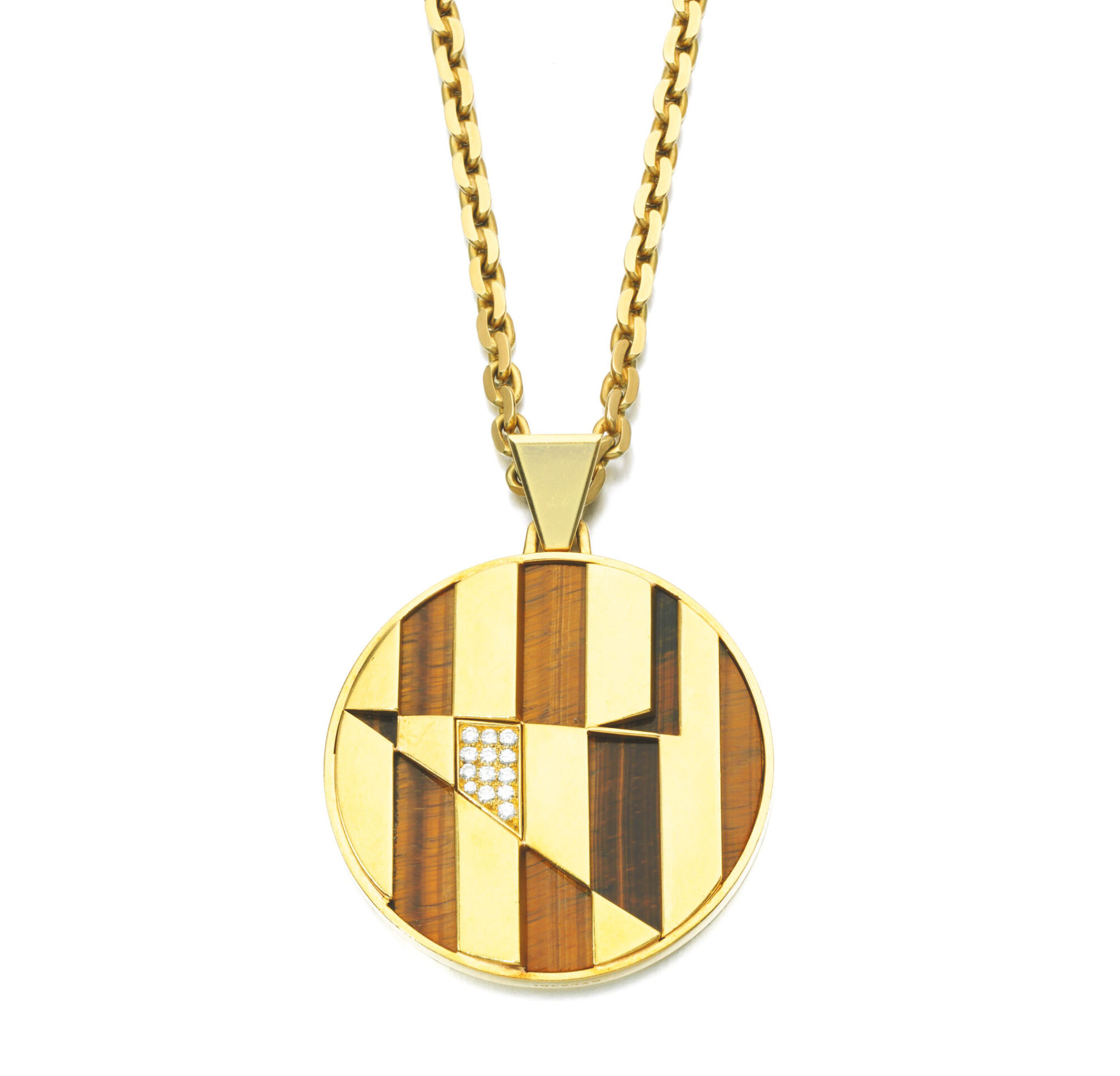 A gold, tiger's-eye and diamond pendant, Bulgari, 1970s.